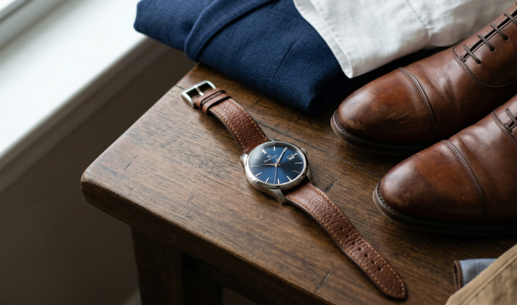 Style Tip: Blue dials are the perfect companion for brown leather straps. The “Blue and Brown” combination is a classic style move that works exceptionally well with smart-casual outfits like chinos and a crisp white shirt.